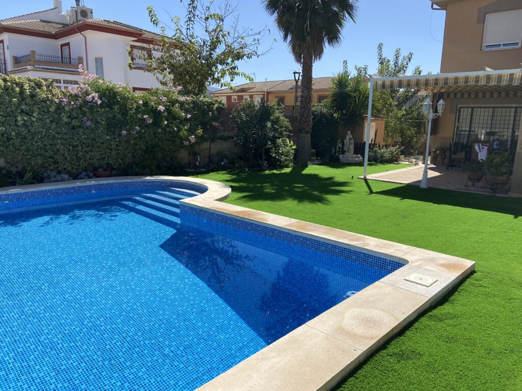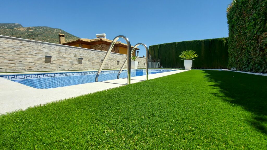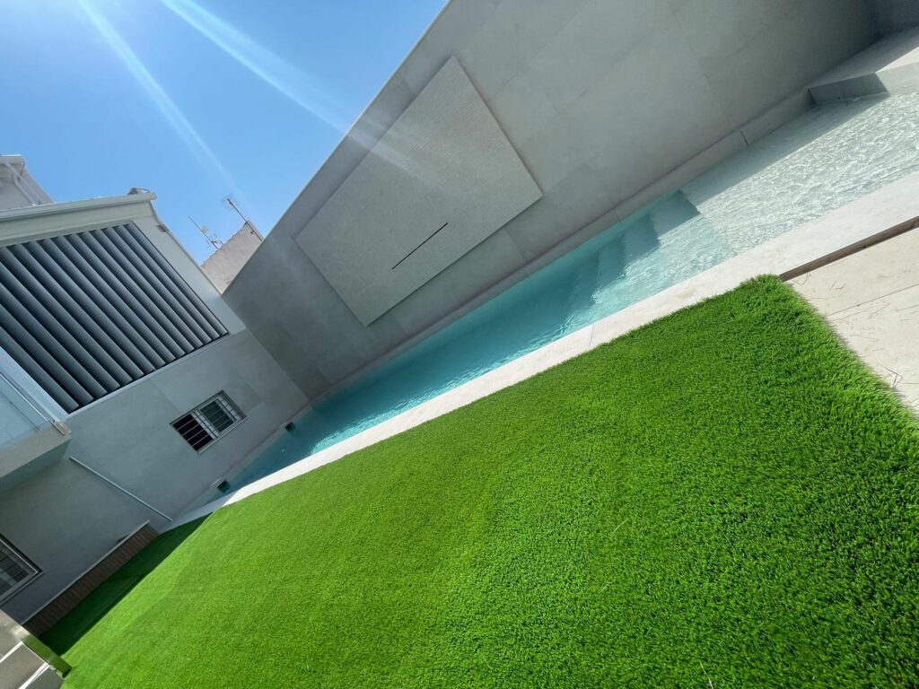 El césped artificial que usamos para piscinas está especialmente diseñado y tratado para aguantar sin problemas en entornos húmedos: resiste perfectamente la humedad constante, el cloro, el salitre y los rayos UV (estabilizado al 100%).