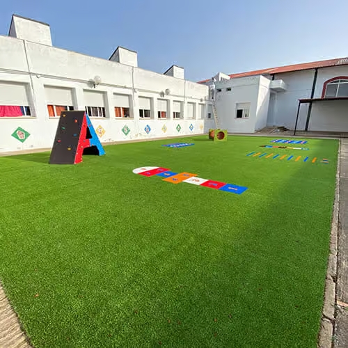 Un césped artificial de alta calidad garantiza una superficie segura al 100%: resistente, libre de tóxicos y bacterias, con excelente acolchado contra impactos y capacidad para aguantar un uso intensivo y pisadas diarias.